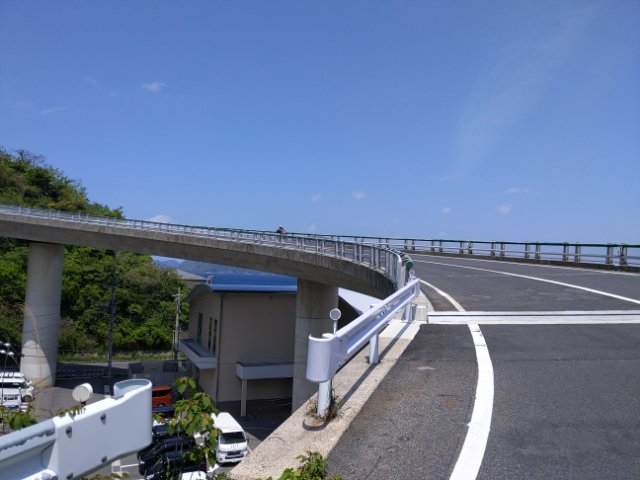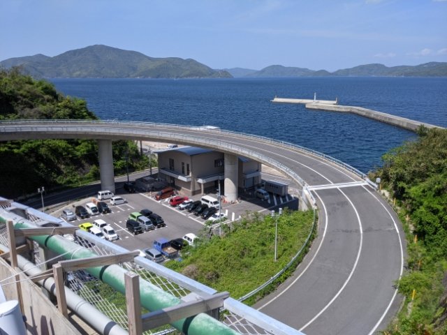 港から出発するには、避けて通れないループ橋。こちらを登らないと、島の周回道路に入る事ができません。