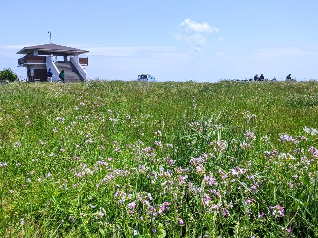 上り坂やウシと戦いつつ、ついにたどりついた赤ハゲ山の展望台。4月下旬から5月上旬は野ダイコンの花期で、展望台の周辺は一面に広がるお花畑となっています。ここは天国でしょうか。