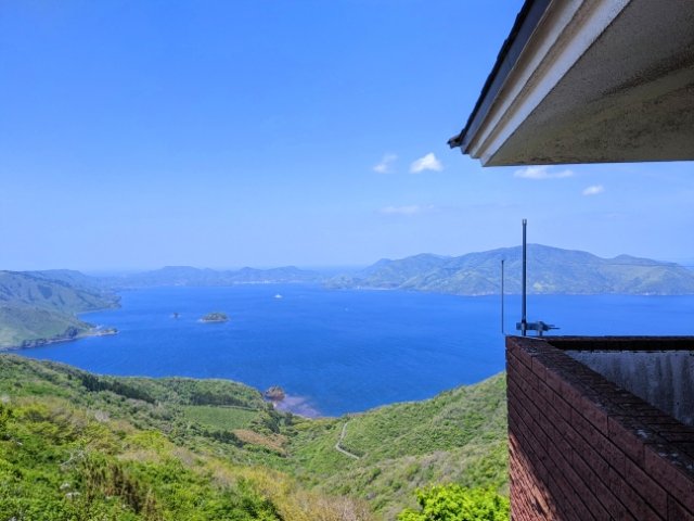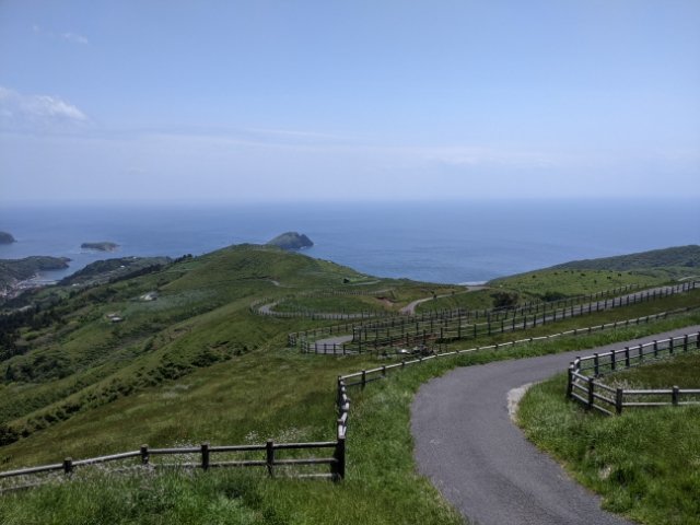 ここは知夫里島の最高峰で、標高は325m。展望台からは、知夫里島に加えて、西ノ島、中ノ島という島前三島を見渡すことができます。この3つの島は、もともと一つの火山。中心の火口が陥没してカルデラになり、海に沈んだ結果、外輪山が3つの島になったのです。
