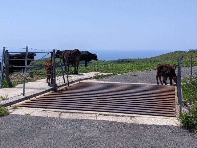 こちら、道が格子状になっています。こちらはテキサスゲートと呼ばれる侵入防止用のゲート。フェンスなど何もありませんが、不思議とウシはここを通過することがないのです。