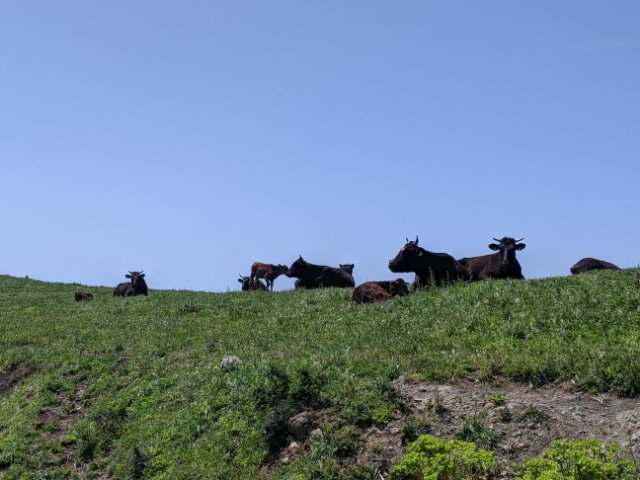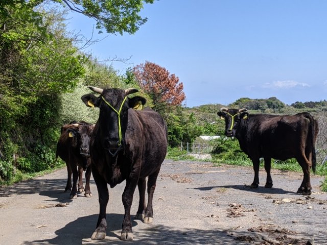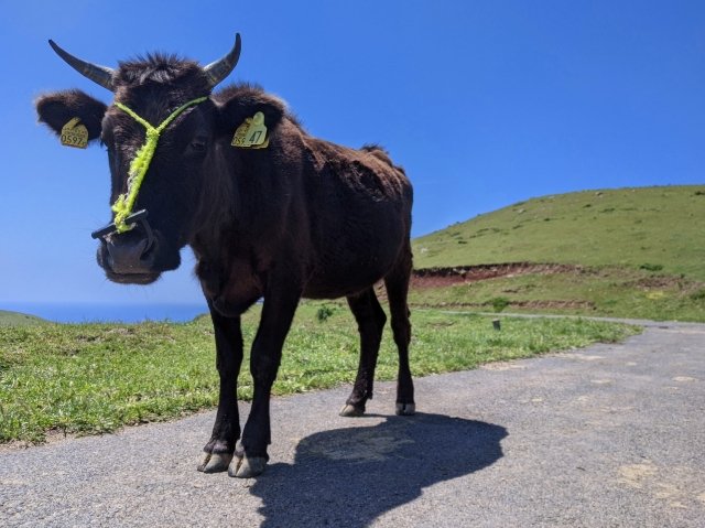 ウシの放牧が盛んな知夫里島、人口600人ほどに対してウシの数は500頭ほどとものすごい数が飼育されています。特に赤ハゲ山へ向かう丘陵地帯にはたくさんのウシが気の向くままに過ごしています。