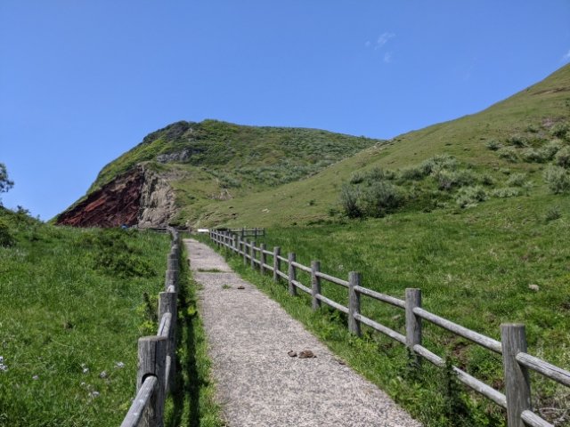 赤ハゲ山からほど近い距離にあるもう一つの名所が赤壁。途中で車止めがあるため、自転車を置いて徒歩で進みます。もちろんここも放牧地ですので足元には注意です。