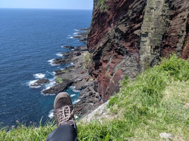 赤壁は、火山活動と海による浸食によって作られた崖。赤く見えるのは噴出したマグマの鉄分が高温のまま空気にふれて参加したためといわれています。