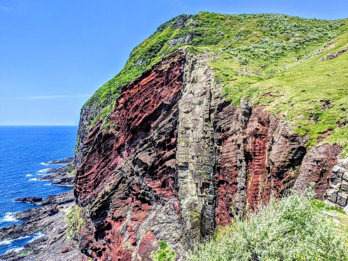 赤壁は、火山活動と海による浸食によって作られた崖。赤く見えるのは噴出したマグマの鉄分が高温のまま空気にふれて参加したためといわれています。