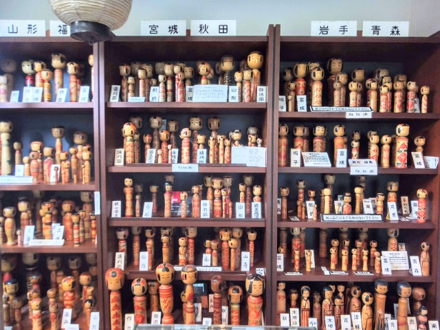 こけし、お面、土鈴、張り子など様々なジャンルの郷土玩具たちがびっしり。都道府県ごとに分けられているため、地元を探したり、地域ごとに見比べたりと楽しむこともできます。