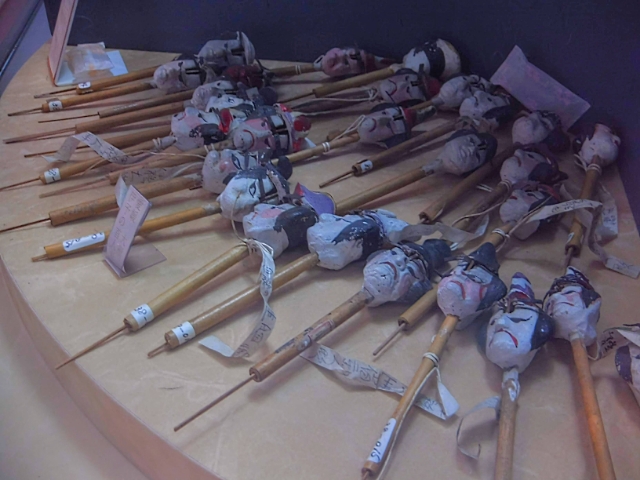 怖い郷土玩具として知名度が高いのは佐渡島の「のろま人形」。佐渡の伝統的な人形劇に登場する4人の登場人物の首人形なのですが、カラフルな生首が連なる様はやっぱりこわい。