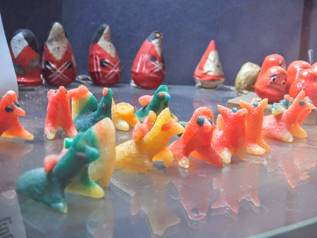 秋田県の「しんこ細工」。なにか樹脂のような不思議な質感の正体は、なんとお米の粉。木や紙、粘土などが多い郷土玩具において異彩を放っています。保存がタイヘンらしいです。