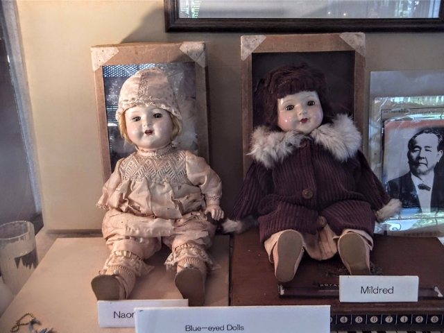 日本らしい雰囲気の中、ちょっと目立つ洋風人形。こちらは青い目の人形のナオミちゃんとミルドレッドちゃん。