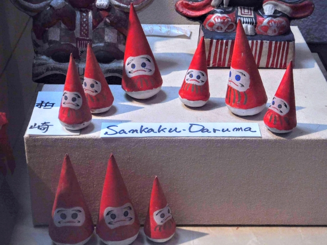 柏崎の「三角だるま」。下部が重く作られているので、倒しても起き上がる起き上がり小法師になってます。ハの字のまゆ毛は、困っているみたいな表情でとってもユニーク。