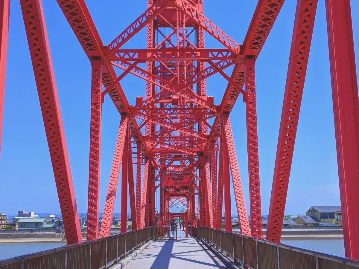 福岡県大川市と佐賀県佐賀市の間を流れる筑後川。そこに架かる真っ赤な鉄橋・筑後川昇開橋は、日本で最古となる現役の昇開橋。川を通る船のため、橋の中央付近がぐぐぐっと持ち上がります!巨大な鉄橋が動く姿は迫力満点です!
