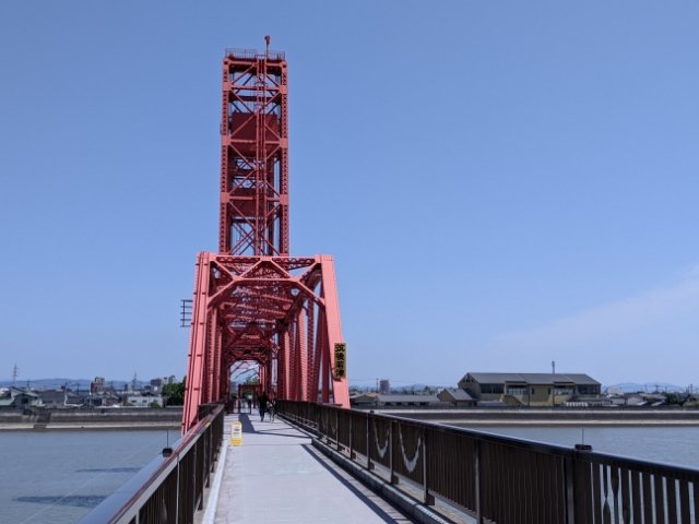 ドロンパからすぐ目の前に赤い橋が見えます。稼働部分までは約300mほど。雄大な筑後川の上を歩いて行くのはとっても気持ち良い!