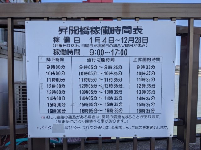 昇開橋の稼働時間は9:00~17:00と決まっています。毎時35分になると持ち上がるため、動く瞬間を見るには、それに合わせて訪問する必要があります。