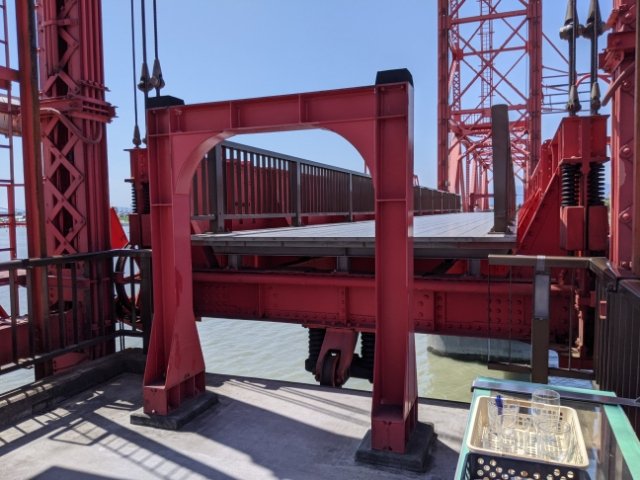 次第にぐぐぐっと橋が持ち上がっていきます。数メートル上がったところでしばらく停止。本気を出したら、最大で23mもの高さまで持ち上がるそうです。