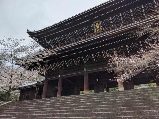 まず訪れる人を出迎えるのは、超巨大な三門。高さ24m・幅50mと日本の寺院の門の中でも最大級の大きさを誇ります。華頂山と書かれた額も畳2畳分というスケール。