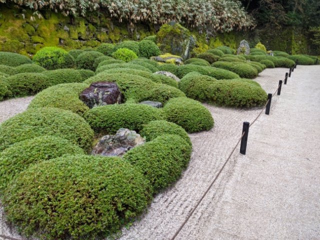 意味深に配置された真ん丸の植え込みと大きな石。こちらは「二十五菩薩の庭」といい、石は菩薩を、植え込みは菩薩を包む雲を現しているそう。