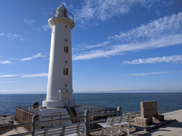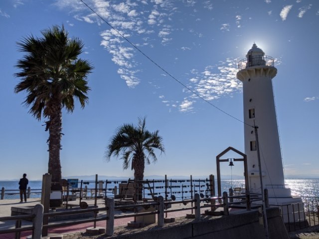 知多半島の西岸に立っているため、午後になると逆光気味で暗くなりがち。そんなときは、灯台の先端に太陽をかぶせて見ると、ちょっと面白い写真が撮れます。