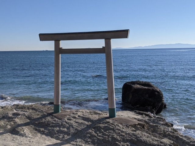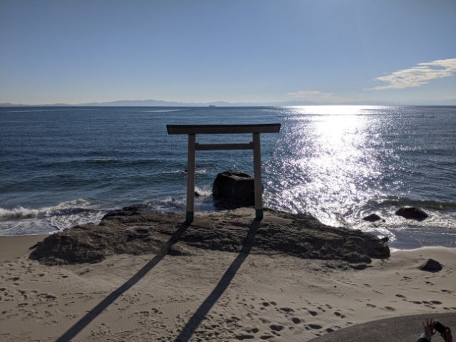 海岸に立つ立派な鳥居がフォトジェニックなスポット。太陽の光を浴びて輝く海との対比がとっても美しい。西向きに位置しているため、夕暮れ時には鳥居の向こうに沈むサンセットも見ることができます。