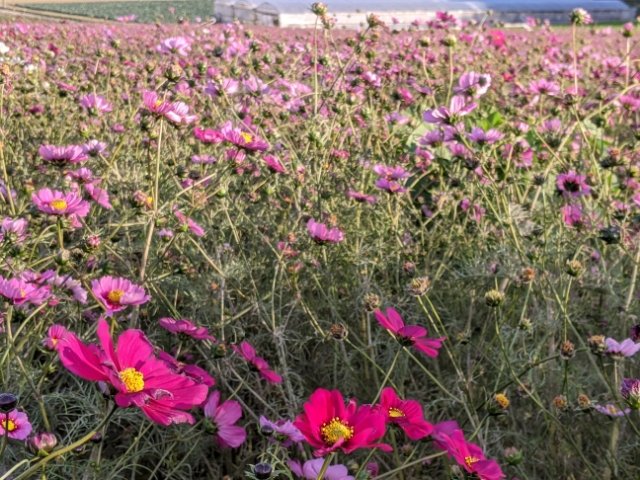 11月後半に訪問したところ、園内では秋の花の代表格・コスモスが咲いていました。ピンクや白の花がふわふわと広がります。