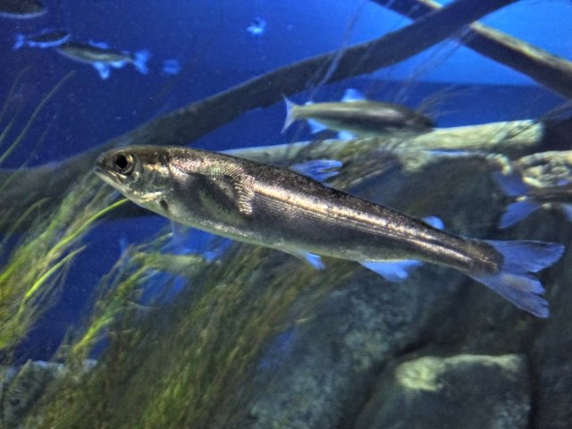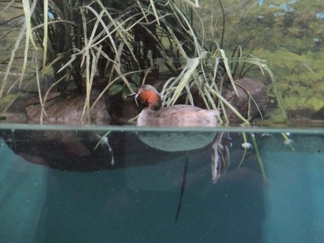 サカナだけでなく、鳥であるカイツブリも混じっています。水中に潜ってサカナを捕ることができる鳥で、こちらの水槽ではそんなカイツブリが水中でどのように泳いでいるか見ることができます。