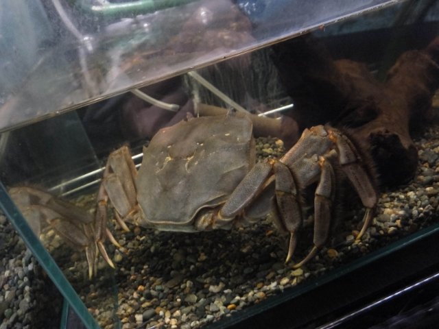 大きなモクズガニ。普段は川で暮らしているけど、繁殖するために海に下る習性があるそう。産卵のために川に戻るサケとは逆です。ちなみに繁殖の際、オスは繁殖可能なメスを識別することができないらしく、オスや別のカニに抱きついてしまうことも多いらしい。