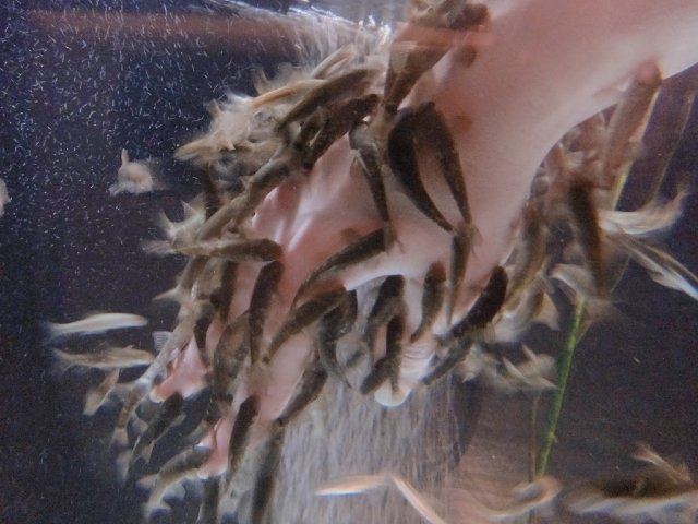 おなじみのドクターフィッシュ。ここのドクターフィッシュはめっちゃアクティブ!手を入れた瞬間この入れ食い具合です。今までたくさんの水族館で体験してきましたが、ここまで食いつかれたのははじめてです!