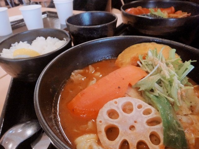 ものすごく迷いますが、今日はスープカリーにします!!えび、鶏、鮭の3種類のスープから選べます。せっかくなので、他ではあまり見かけない鮭スープでやわらかチキンカリー。ほろっほろの鶏肉はスプーンで簡単にほぐれます。