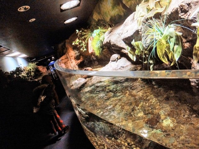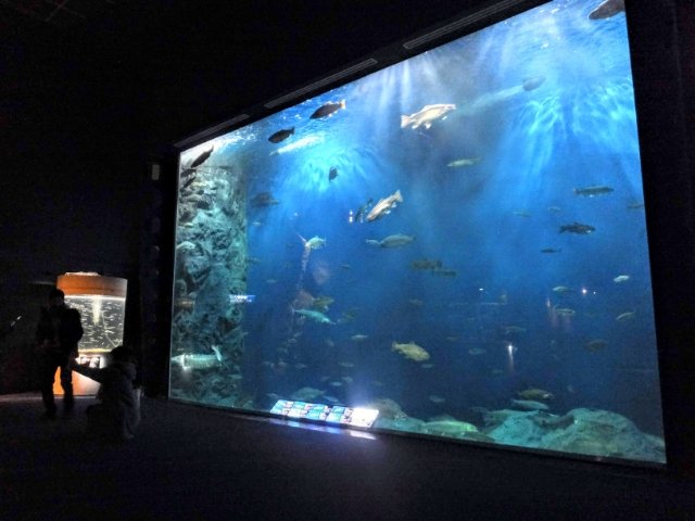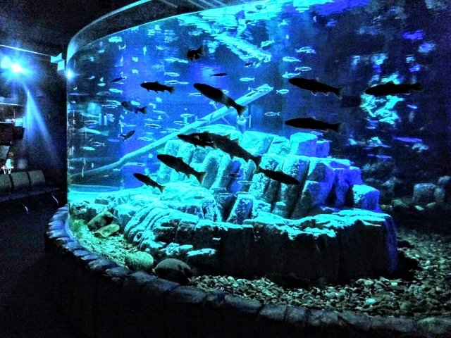 サケ類を中心とした淡水魚水族館。淡水魚=地味かと思いきや、照明や水槽のデザイン性が高く見ごたえ抜群。実際の川の中を覗くことができる観察窓からは、季節によって様々なサカナが流れていく様子を見ることができます。