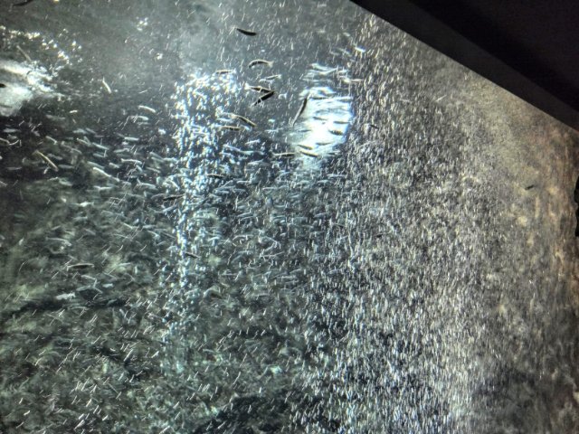 こちらは、おびだだしい数のサケの稚魚たち。ぶくぶくとした気泡の中をキラキラと泳いでおり、ずっと眺めていられそうな美しさ。
