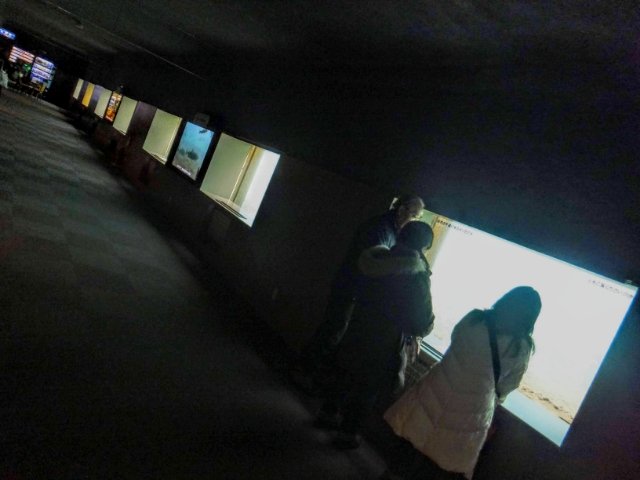 薄暗い部屋に並んだ窓、こちらこそが千歳水族館の目玉である水中観察窓。