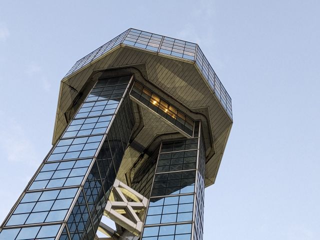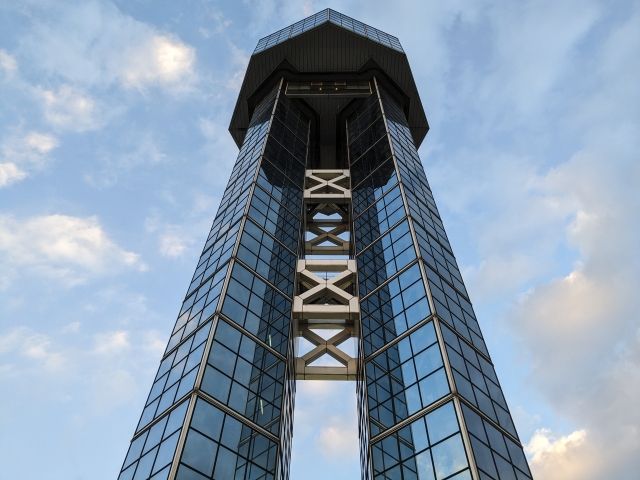 このタワーの特徴といえば、2つのタワーが並ぶ超個性的な外観。ハーフミラーガラス(マジックミラー)で仕上げられたボディは、太陽光を反射してキラリと輝きます。四角形のミラーが積み重なる姿は、ルービックキューブの様にも見えてきました。