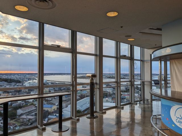 展望室はそれほど広くありませんが、床から天井まで広がる大きなガラス窓のおかげでとっても開放的。周辺の景色を余すことなく眺めることができます。