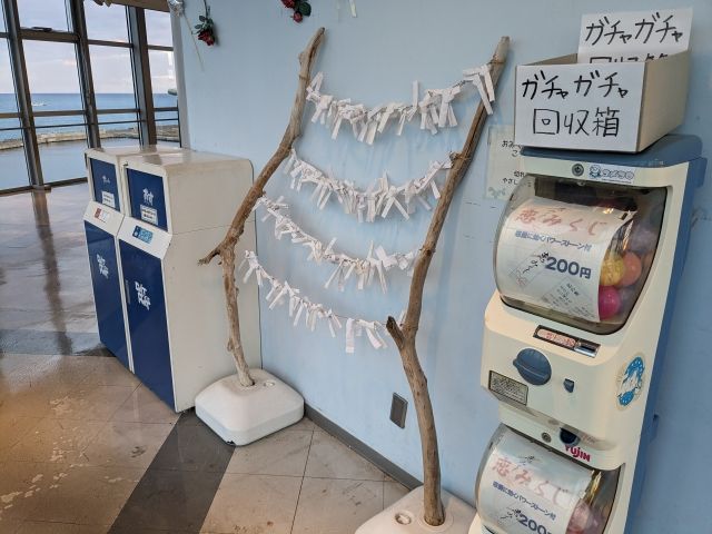 カプセルに入ったパワーストーン付の恋みくじもあります。流木でつくられた結び紐も置かれていました。