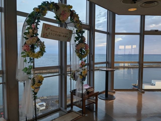 ウエディングな雰囲気のフォトスポット。このタワーが立っている夫婦ヶ鼻という崖にちなんで作られたものであるそう。なんと、スタッフさんの手作りとのことです。
