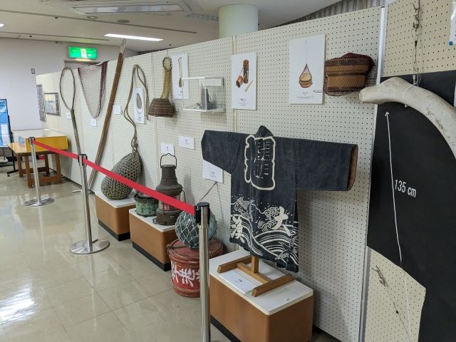 エレベーターで降りた2階は展示ホール。銚子で見つかったアンモナイトなどの化石や、かつて利用されていた漁具が展示されています。