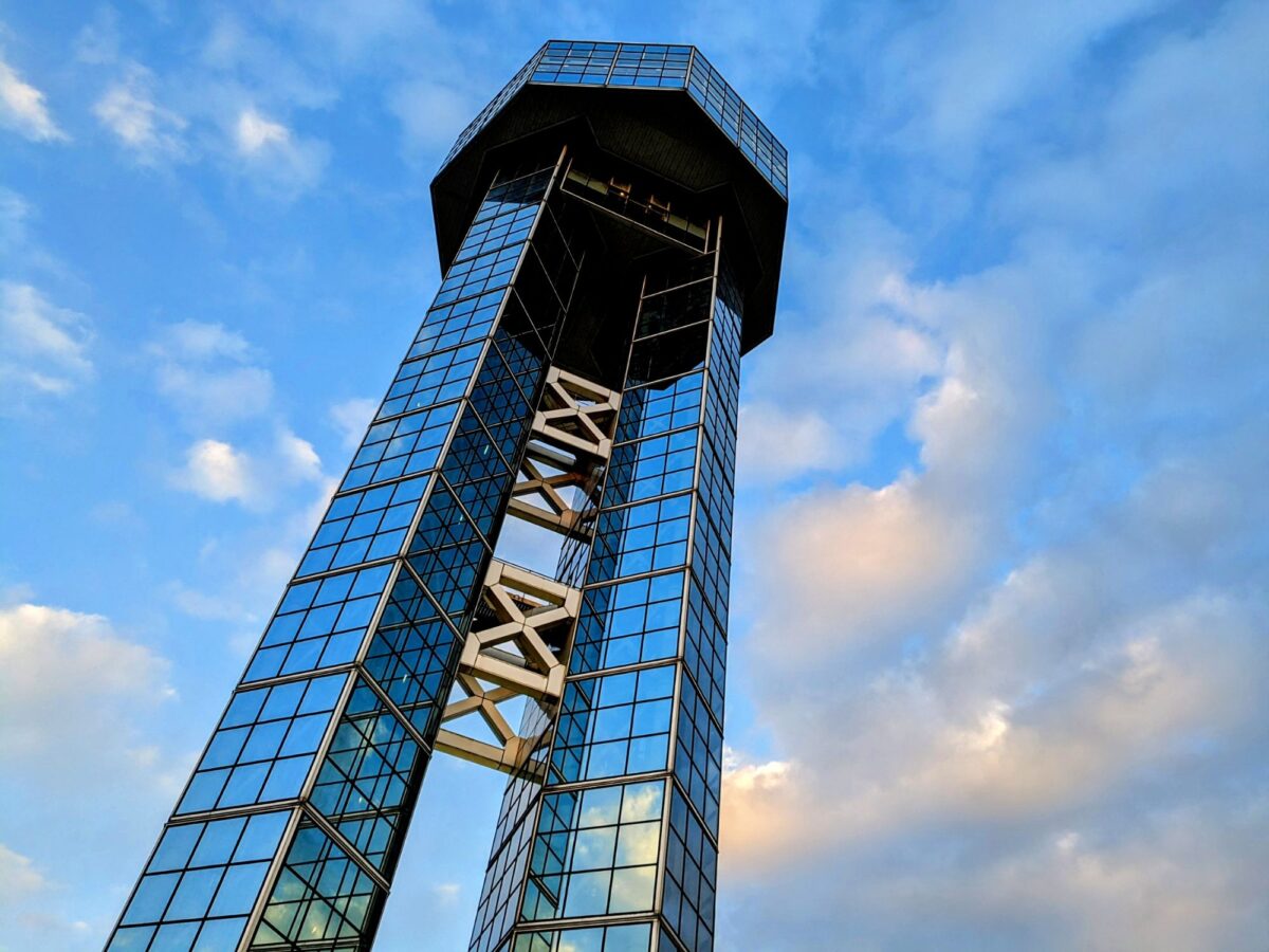このタワーの特徴といえば、2つのタワーが並ぶ超個性的な外観。ハーフミラーガラス(マジックミラー)で仕上げられたボディは、太陽光を反射してキラリと輝きます。四角形のミラーが積み重なる姿は、ルービックキューブの様にも見えてきました。