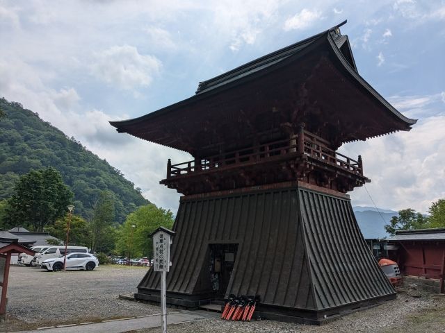 楼門の先には鐘楼。諸願成就の梵鐘が吊るされており、その音色は湖上に響き渡るそうです。