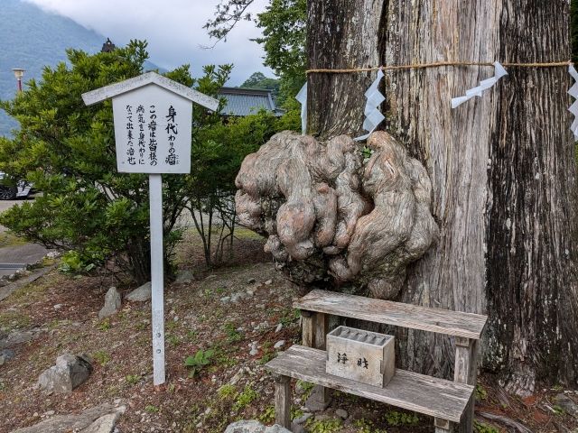 こちらの木の根元に膨らんだコブは、身代わりの瘤(こぶ)。参拝者の病気の身代わりになってできた瘤とされています。
