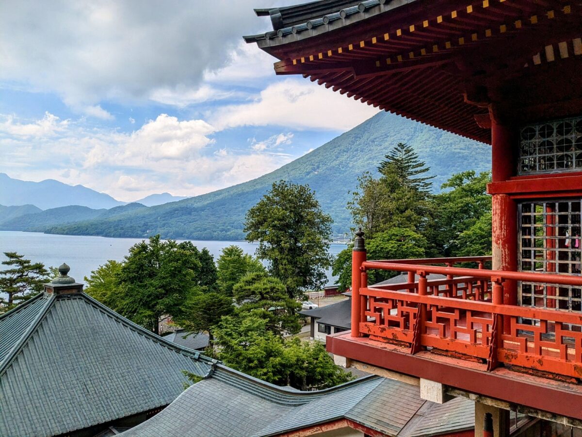 お堂の外に出ると、目の前に広がるのは穏やかな中禅寺湖。お堂が高い位置にあるため、見晴らしは抜群です。