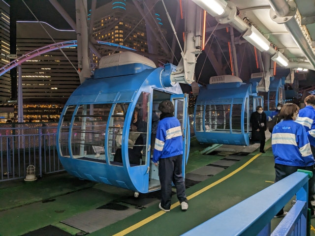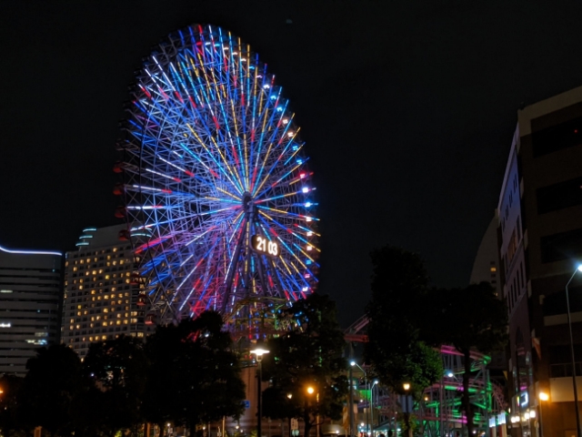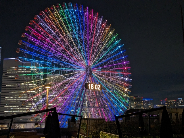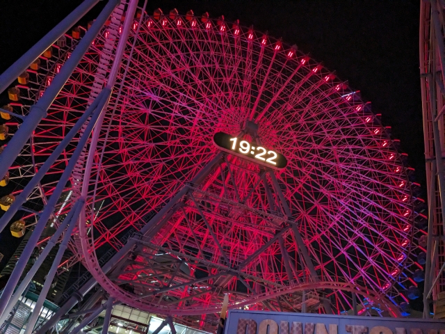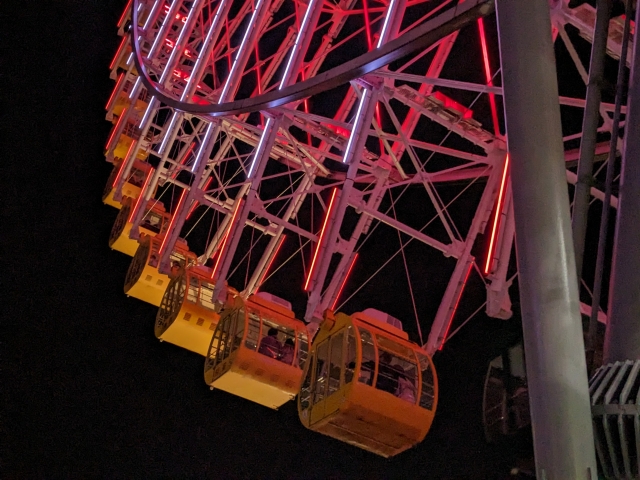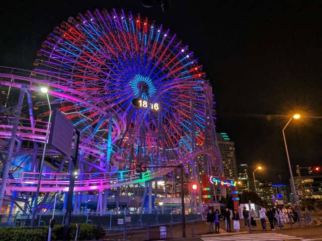ただし、周辺はカップヌードルミュージアムなどの観光スポットやワールドポーターズなどの商業施設が集まる人気のエリア。非常に混雑する可能性があります。今回土曜日の18:00頃に向かったところ、遊園地の外から見てもわかる大行列が・・・。今回はひとり乗車なので、行列に並ぶのはハードルが高いです。ということでもう少し遅い時間にまた来よう。