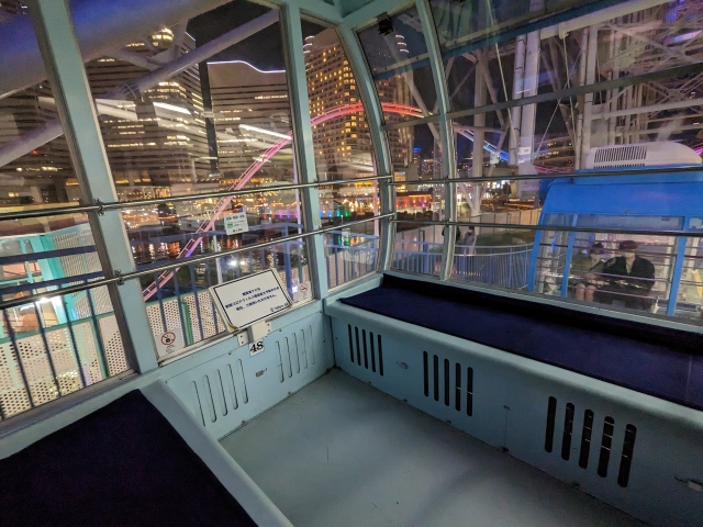 ゴンドラは8名乗りでとっても広々。周辺情報や横浜の歴史を学べる観覧車ナビというタブレットも設置されていますが、コロナ対策のため使用停止中。