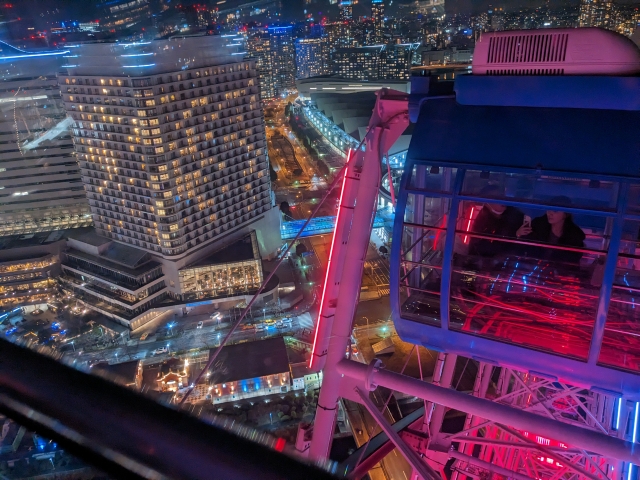 ゆっくりと夜空に飛び上がって行くゴンドラ。純粋に夜景を楽しむならばランドマークタワーの方がゆったりできて良いですが、少しずつ景色が変わって行くのが観覧車の醍醐味です。