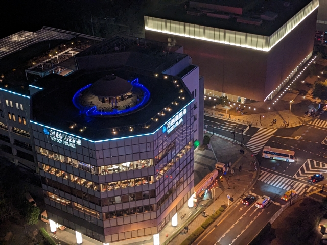 こちらは日帰り温泉施設「横浜みなとみらい万葉倶楽部」。屋上には光輝く足湯を備えており、くつろぐ人たちの姿も見えます。