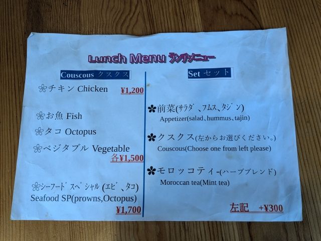 チキン、フィッシュ、タコ、ベジタブル、シーフードスペシャルの5種類の「クスクス」。+300円でサラダ、フムス、タジンの「前菜」と「モロッコティー」を付けることも可能!とってもお得な気がするので、ランチメニューにします!