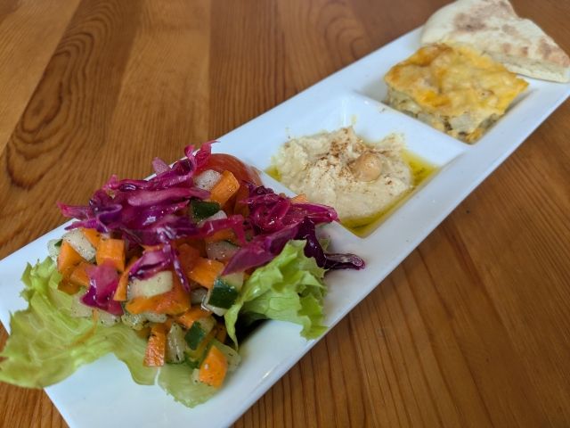 サラダはキュウリ、ニンジンなどが入った細かめタイプ。酸味のあるドレッシングでマリネのような感じです。フムスはひよこ豆のペーストで、豆乳やお豆腐のような風味。たぶんですが、パンはこれをつけて食べるような気がします。