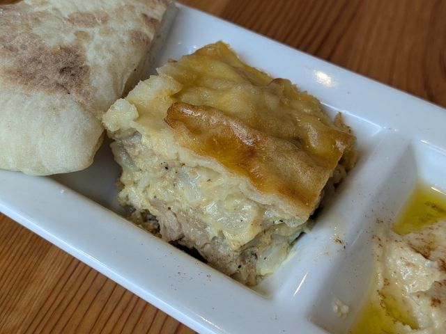 そしてこちらがタジン。タジンと聞くとタジン鍋を使った蒸し料理が浮かびますが、チュニジアのタジンといえばキッシュのこと。チキンとオニオンが入っており、表面はパリパリに焼き上がっています。これがめっちゃ美味しいんですよ!