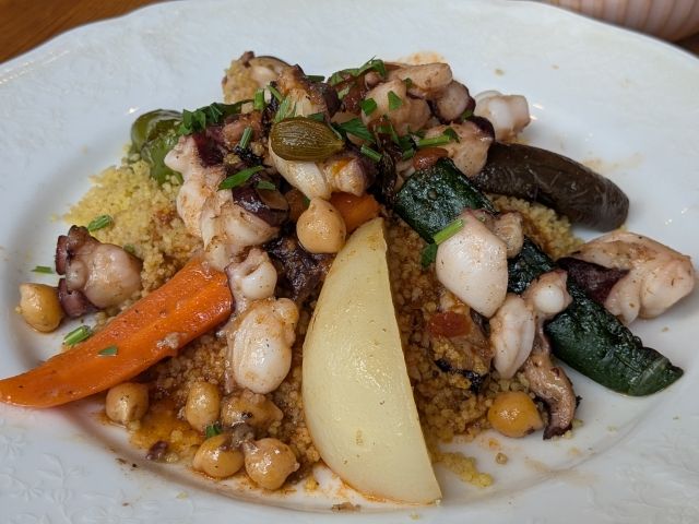 タコのクスクスが到着しました!目につくのは大きな野菜。ピーマン、ジャガイモ、ニンジン、ズッキーニ、大根、ナスがキレイに並べられています。ひよこ豆もたっぷり入ってます!