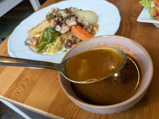 クスクスには、こちらのスープをかけて食べるそう。トマト系のサラッとしたタイプで、他では食べたことがない風味。けっこう辛味があります!クスクスそのままでも味がありますが、コレをかけると良い感じにパンチが効いたお味に。