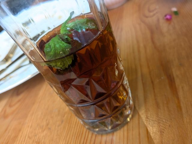 ちょうど食べ終わ頃にランチセットのモロッコティーが到着。クローブの風味が効いたスパイシーさも感じるハーブティー。ほんのり甘さがあるので飲みやすく、食後にぴったりでした!
