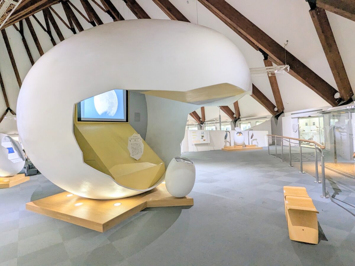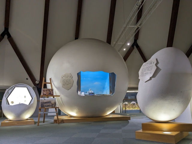 卵のカタチをしたシアターでは「ツルの1年」という7分間の映像を上映中。動画のなかでは、3月にロシアへ帰る「北帰行(ほっきこう)」の実際の映像も。数千羽のツルが羽ばたき空へ舞い上がる姿は圧巻です。