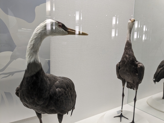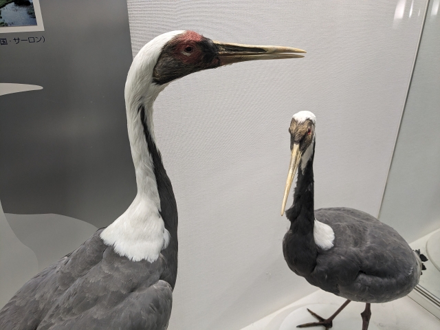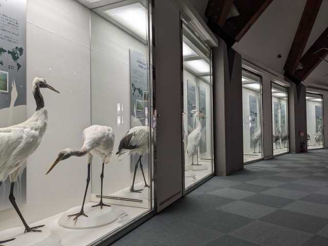 ずらりと並んでいるのはタンチョウ、ソデグロヅル、クロヅル、ナベヅル、マナヅル、カナダヅル、アネハヅルといった、出水で見ることができるツルの解説。実物大の模型や剥製が置かれているので、その大きさも体感できます。
